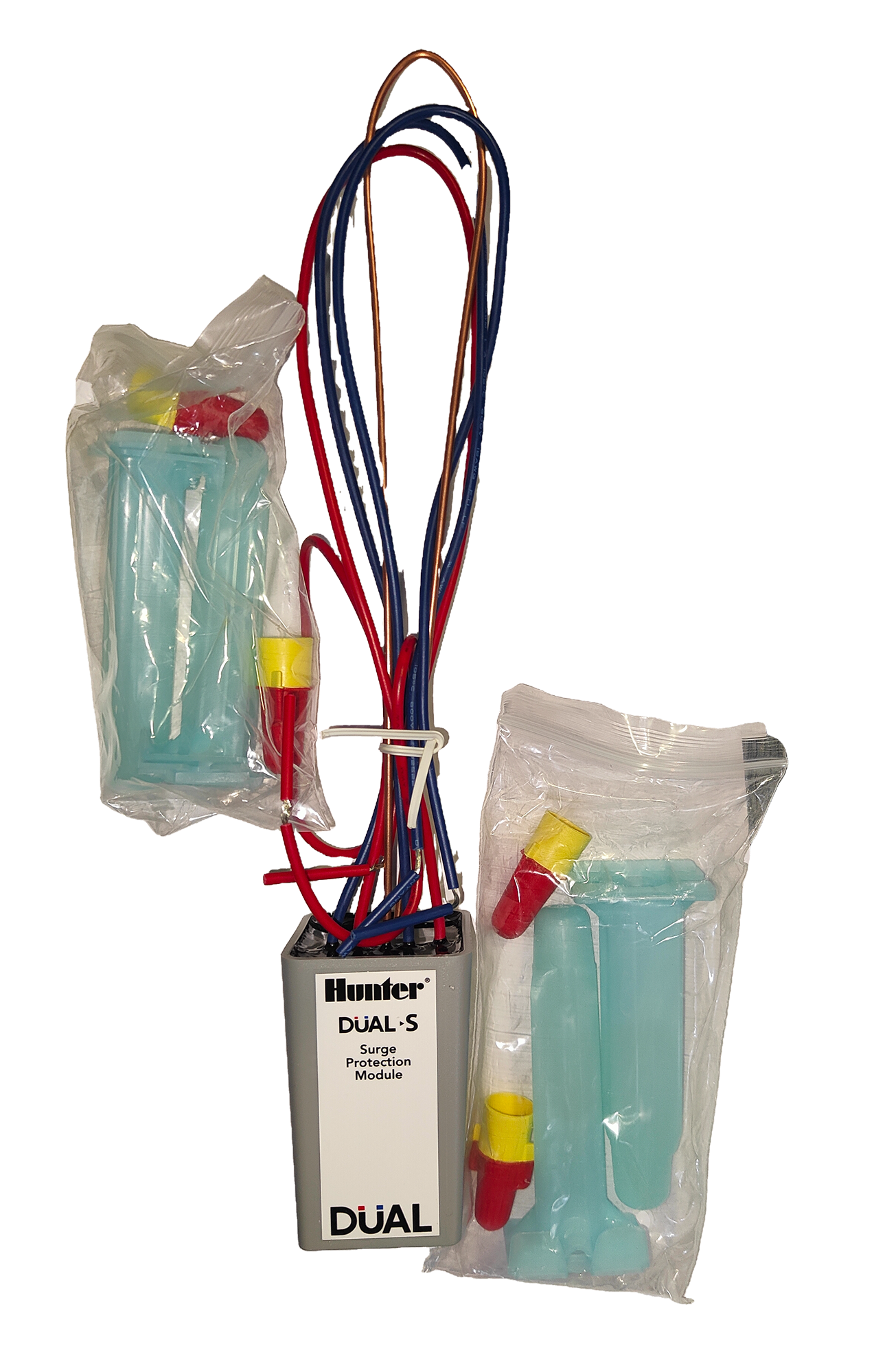 Hunter DUAL-S-S — это ограничитель перенапряжений для двухпроводных декодерных линий систем автополива. Устройство устанавливается последовательно в разрыв двухпроводной линии (in-line) и защищает тракт датчиков/декодеров от импульсных перенапряжений и наводок. Монтаж выполняется в клапанном боксе с технологическим запасом провода, после чего линия снова сращивается через красно-синие пары проводов устройства.